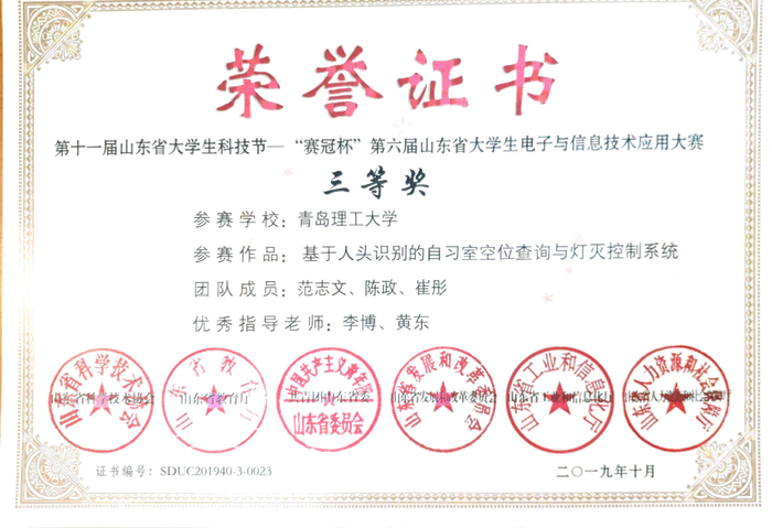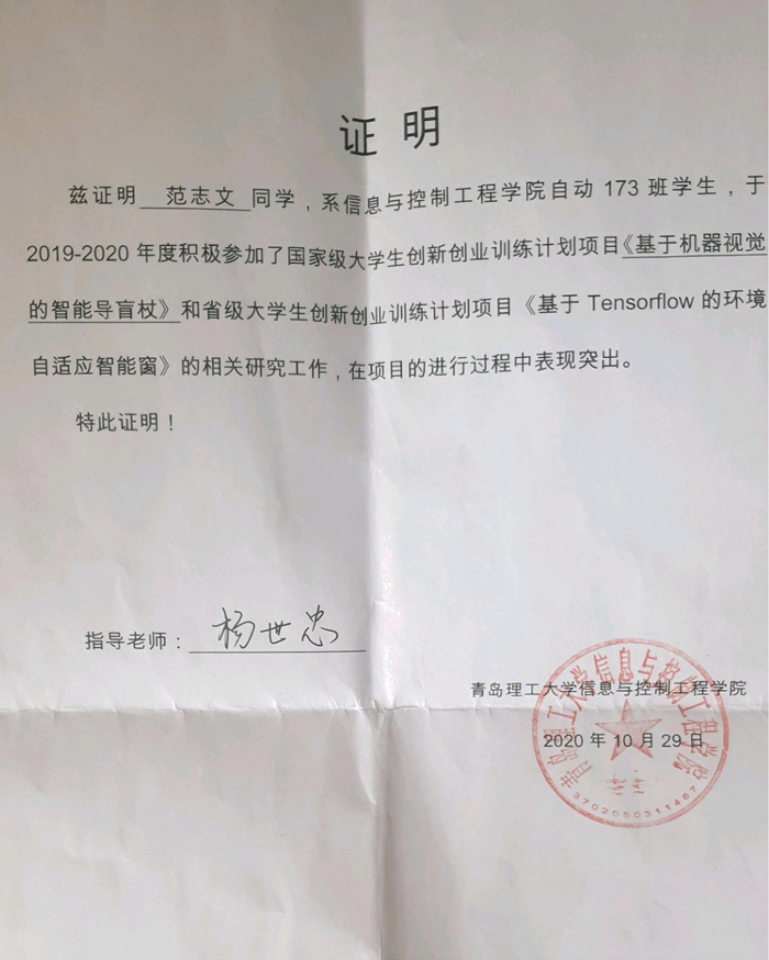 范志文,通过英语四级、计算机二级。曾获得青岛环球奖学金、省二等奖一项、省三等奖一项。参与国创、省创各一项,均已顺利结题。共发表学术论文两篇,其中科技核心一篇(二作),普刊一篇。以优异的成绩成功进入华南农业大学。
