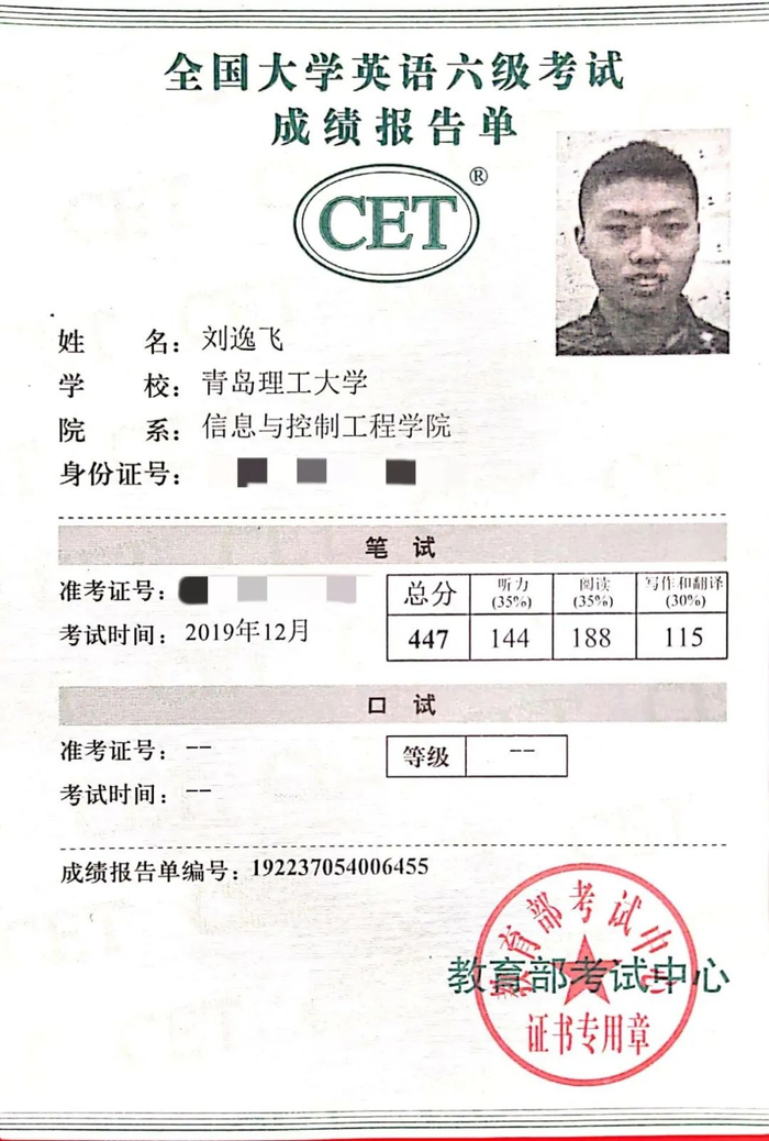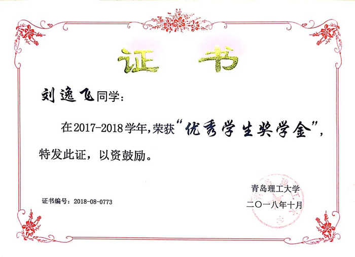 刘逸飞,一次性通过计算机二级、英语四六级。大学四年学习成绩名列前茅,专业排名前10%,以初试第一(425分)、综合成绩第一的成绩进入哈尔滨工程大学。