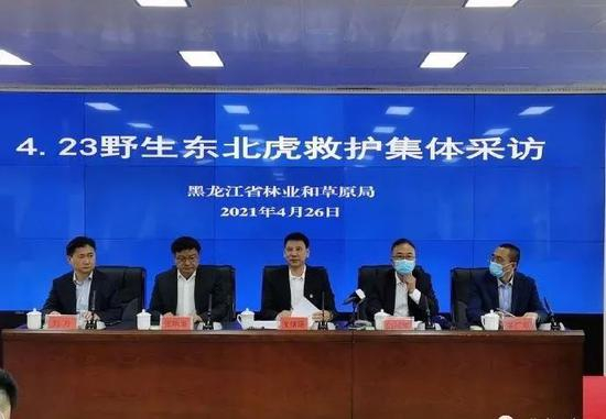 4月26日,黑龙江省林业和草原局举行新闻发布会,就4.23野生东北虎救护情况进行了通报。