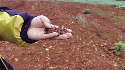“祁阳这里,是典型的第四纪红色黏土发育的红壤,”蔡泽江抓起一把红土,黏成块状的红土上,可以看到很多不同颜色的斑点或条纹,“这些都表明土壤中的各种金属元素矿物类型和含量存在明显差异,从这些颜色可以看出,这块地里的土壤确实很贫瘠。”