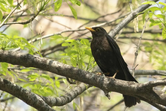 乌鸫又叫百舌,因叫声婉转动听而得名,全身或大部分羽毛为黑色、黑褐色或乌褐色,有的沾锈色或灰色,长喙,嘴黄,眼珠呈桔黄色,羽毛不易脱落。