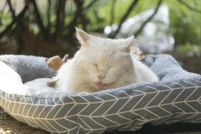 慵懒的狮子猫常趴在自己的小窝里,由于它“亲民性”的性格在校园里面收获了一大批粉丝,它好像很享受那种被呵护的感觉,一天闲来无事便趴在草地上沐浴着阳光等待着下一位同学爱的抚摸。