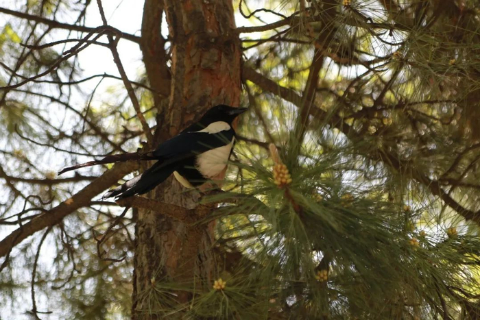 习惯在校园中生活的它们丝毫不怕师生,甚至还很有人缘——常常可以在学生活动频繁的地方看见它们。在校园里,喜鹊常常结成大群成对活动,白天在校园内的绿化草坪上觅食,夜间在教学楼前高大乔木的顶端栖息。每日到清晨,它们总用清脆的嗓音同上课的同学亲切地打着招呼。