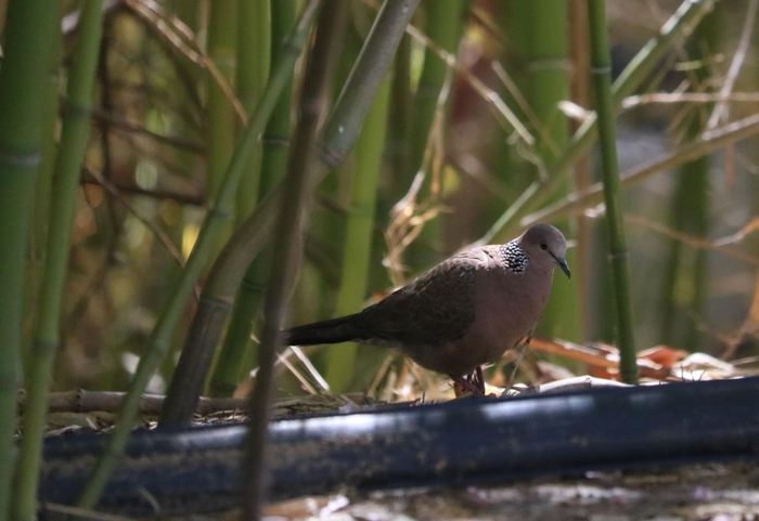 珠颈斑鸠俗称“野鸽子”,属中型鸟类,头为鸽灰色,上体大都是褐色,下体为体粉红色。颈部满布以白色细小斑点形成的领斑,尾甚长。