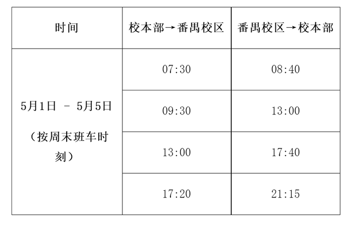 根据学校关于“五一”国际劳动节放假安排的通知精神,结合番禺校区实际情况,2021年“五一”假期期间校本部来往番禺校区的教学班车作如下调整: