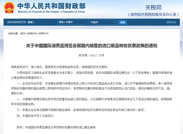 为贯彻落实《海南自由贸易港建设总体方案》,经国务院同意,财政部、海关总署、税务总局联合印发《关于中国国际消费品博览会展期内销售的进口展品税收优惠政策的通知》,这是落实中国国际消费品博览会境外展品免税政策、建设国际旅游消费中心、扩大对外开放、提升海南自由贸易港国际形象和影响力的重要举措!