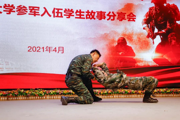 莘莘学子赴军营,绽放青春谱华章。4月27日,“携笔从戎 精忠报国”参军入伍学生故事分享会在九号楼演播厅举行。我校参军入伍学生优秀代表,与副校长彭双阶、本科生院(学生工作部(人武部))等相关单位负责人、师生代表分享了他们立志从军、排除万难、报效祖国、收获成长的故事。