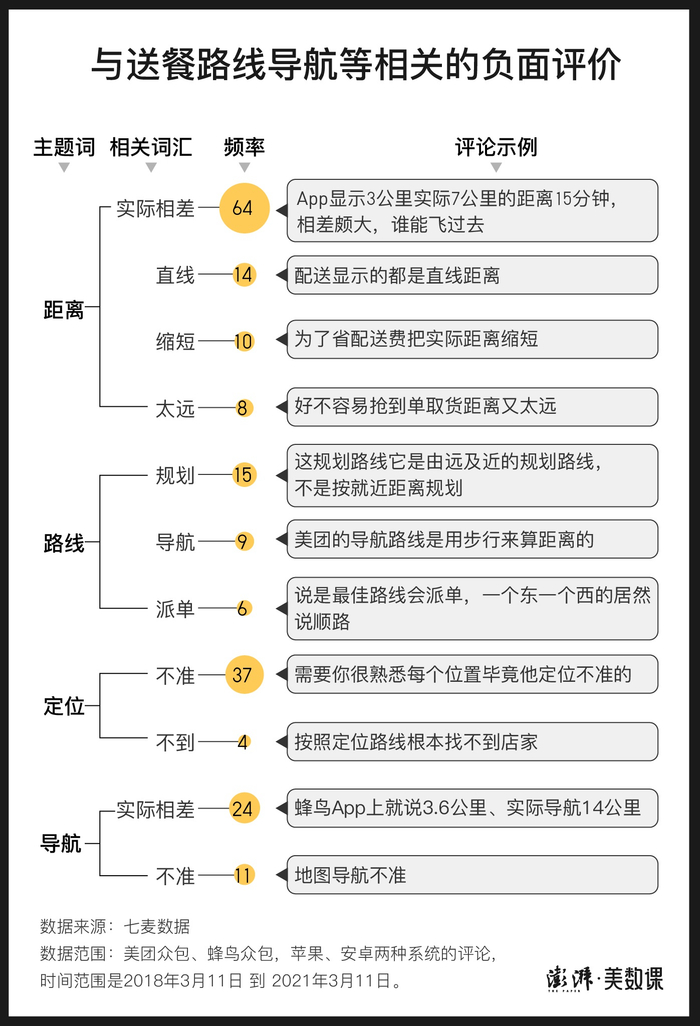 这些负面评价主要围绕两个主题。首先是送餐系统,如下图所示,骑手用户最常抱怨的是,众包App的计算距离和实际距离的相差之大。一些用户反映,众包App会计算成直线距离,和导航App的结果有时差了几公里。