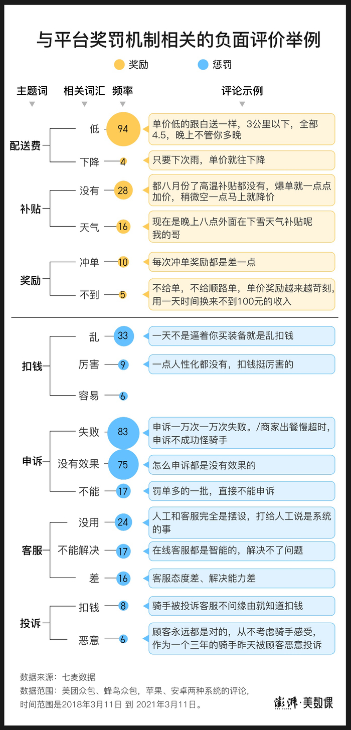 平台苛刻的奖罚机制,是App负面评价围绕的另一主题。如图所示,配送单价降低是最常被提到的。18年底的一条评论写道:“一天10个多小时,平均一个小时不到10元,不给单,有时候一天都没100元”。