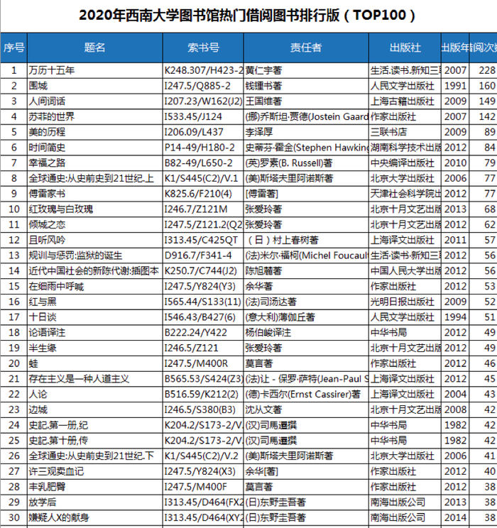 今年,学校图书馆发布的全年借阅热门的100本图书排行榜中,借阅量前十强几乎与往年一致,主要为人文社科经典。分别是:《万历十五年》(黄仁宇著),借阅228人次;《围城》(钱钟书著),借阅160人次;《人间词话》(王国维著),借阅149人次;《苏菲的世界》(挪威乔斯坦·贾德著),借阅142人次;《美的历程》(李泽厚著),借阅89人次;《时间简史》(美国史蒂芬霍金),借阅84人次;《幸福之路》(英国罗素著),借阅79人次;《全球通史(从史前到21世纪)》(美国斯塔夫里阿诺斯著)与《傅雷家书》(傅雷著)并列第9位,借阅均为77人次;第10名为《红玫瑰与白玫瑰》(张爱玲著),借阅68人次。