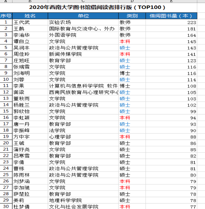 学校图书馆此次大数据还公布了全年借阅量最大的前百强师生读者。其中,借阅量名列前三名的均为教师,其中借阅量第一的王代武老师全年借书223本,2018年他就曾以年借阅量390本得了“冠军”。此次进入借阅量排行榜前100名的师生中,在读硕士“打主力”,总计47人,在读博士18人,本科生24人,教师11人。可以看出硕士、博士占了较大比重,说明图书借阅主要是用作学术研究之用。
