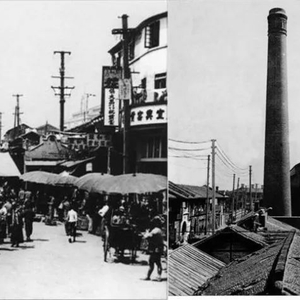 ▲ 杨树浦旧景(拼版照片)。杨树浦电厂硕大的烟囱(右图)是杨树浦的标志