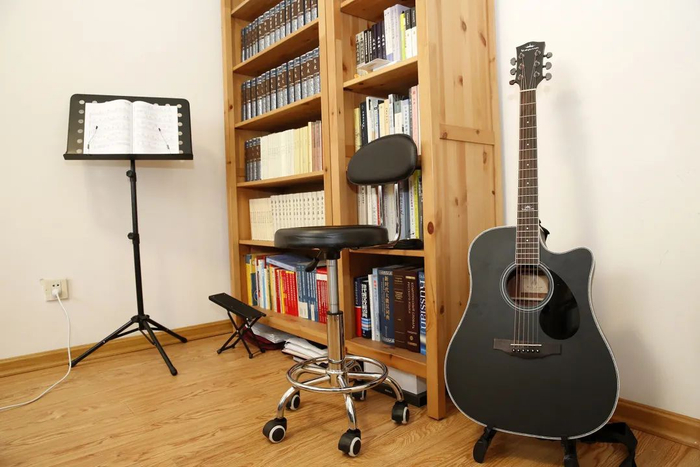 两排落地大书柜,一张简单的书桌,一个插满笔的笔筒,一把精巧的吉他,姜永伟副教授的书房沐浴在午后的阳光里,阳光透过窗户,穿过茶水上方一点点升起的白烟,悄悄地撒满了一整个书房。他说:“貌似曾有人说过,书房就是天堂的样子,阅读能让我变得更加坚韧和温暖”。
