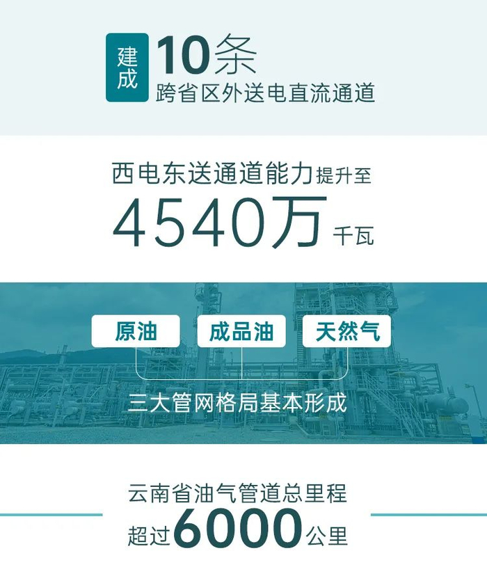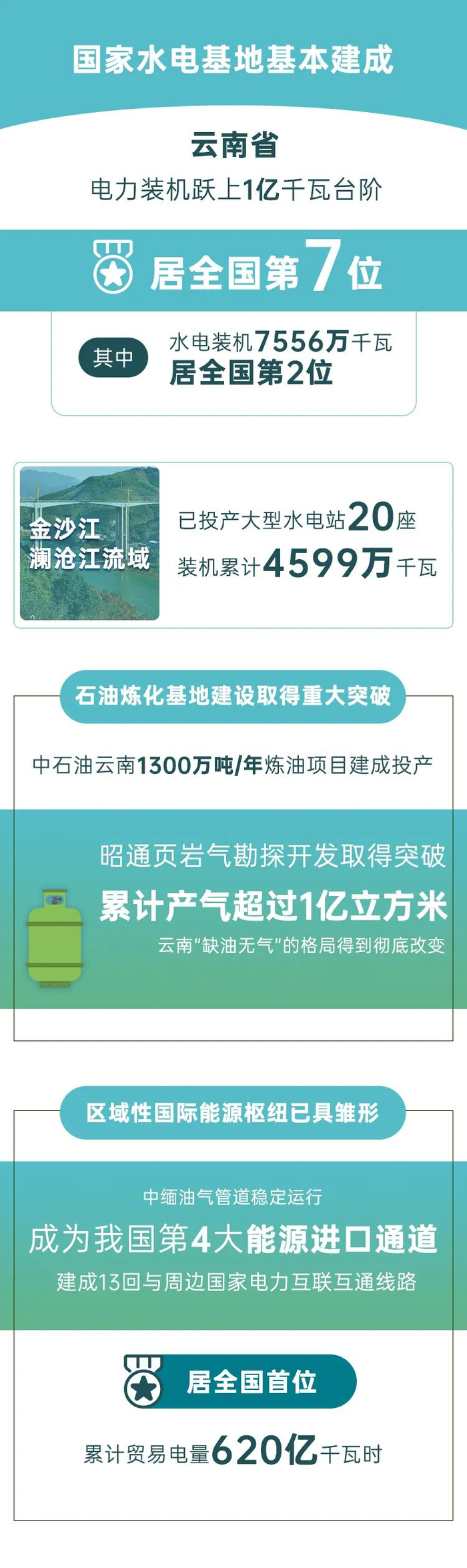 能源发展亮点纷呈,国家大型水电基地建设顺利推进,金沙江中下游、澜沧江流域绿色能源带已具雏形,白鹤滩水电站首批机组将于今年投产发电。我国第四大能源进口通道中缅油气管道建成投运,1300万吨/年炼油项目建成投产,“缺油少气”格局得到彻底改变。
