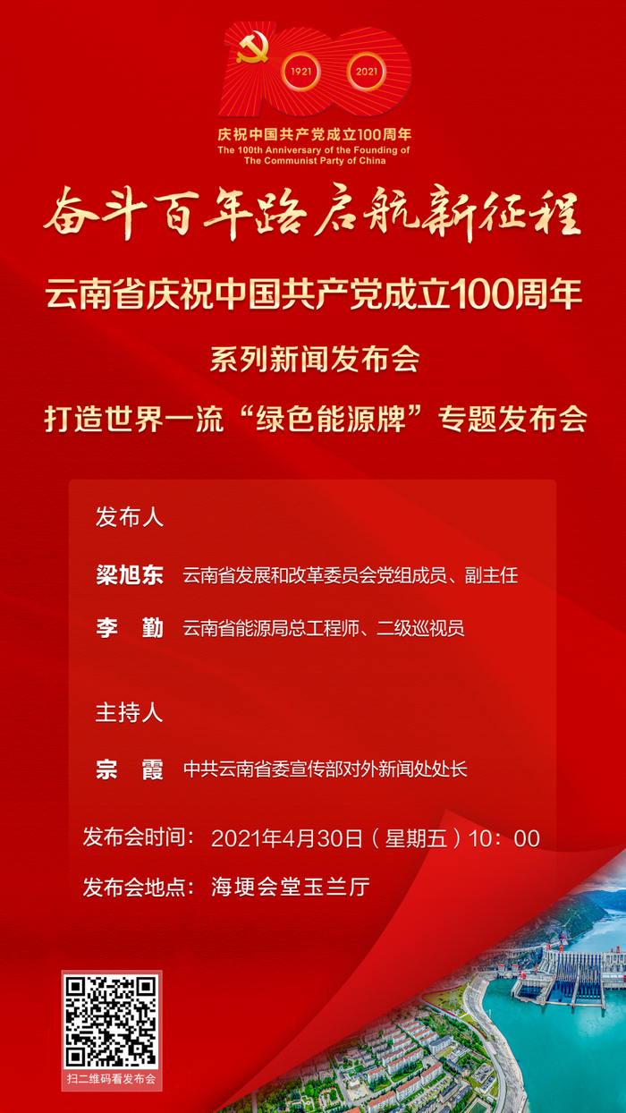 4月30日,“奋斗百年路 启航新征程”云南省庆祝中国共产党成立100周年系列新闻发布会第四场·云南省打造世界一流“绿色能源牌”专题发布会在海埂会堂召开。
