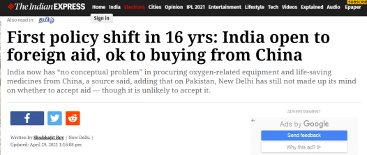 “16年来首次政策转变:印度开放(接受)外来援助,(表示)可以从中国订购(物资)。”印度国内新冠疫情形势严峻之际,《印度快报》29日以此为题援引消息人士的说法描述了印度的一项“重大政策转变”。