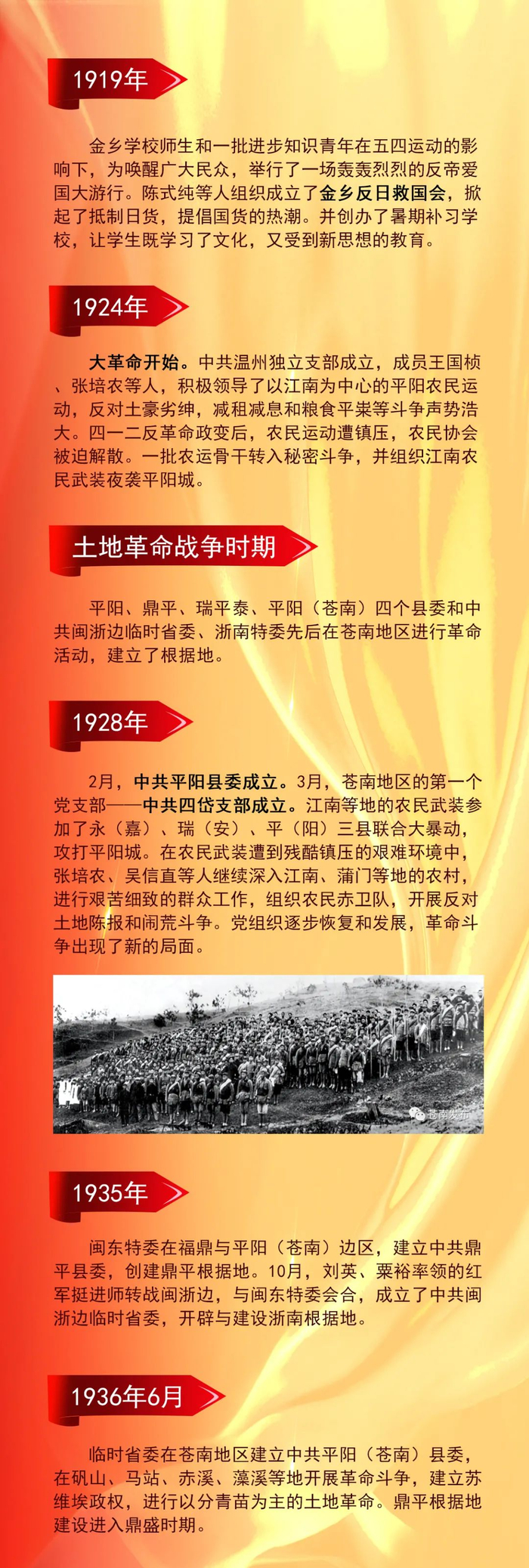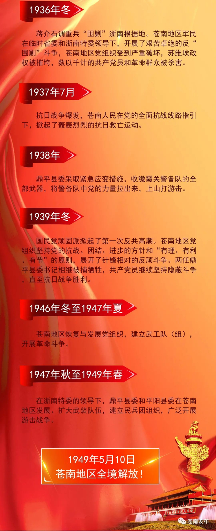 苍南是浙江省革命老根据地县之一。在革命战争时期,作为鼎平革命根据地的重要组成部分,对敌斗争从第二次国内革命战争一直坚持到苍南全境解放,全县共有770名烈士为中华民族的解放事业而壮烈牺牲。