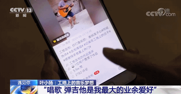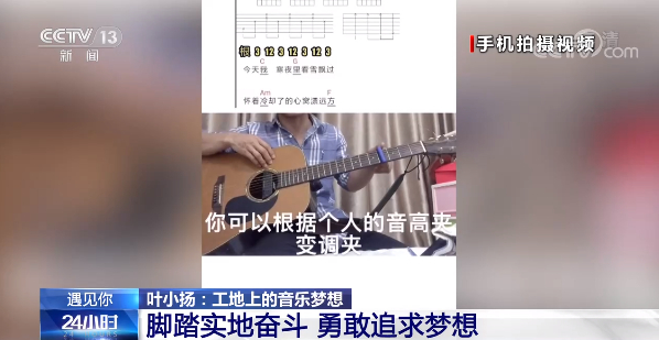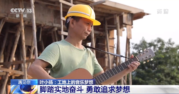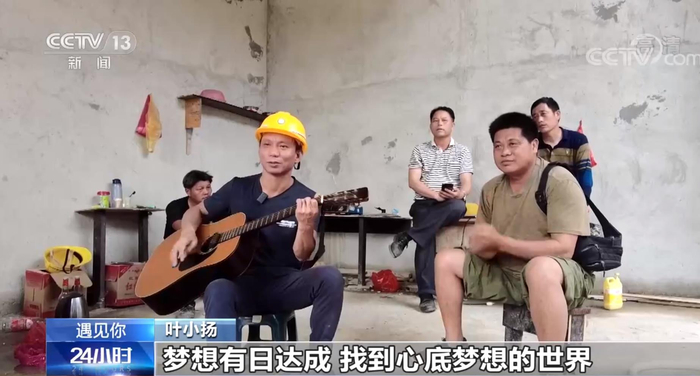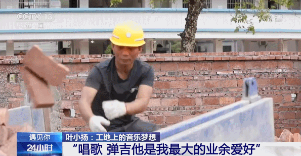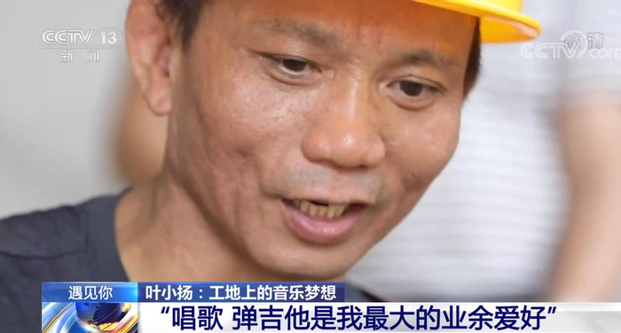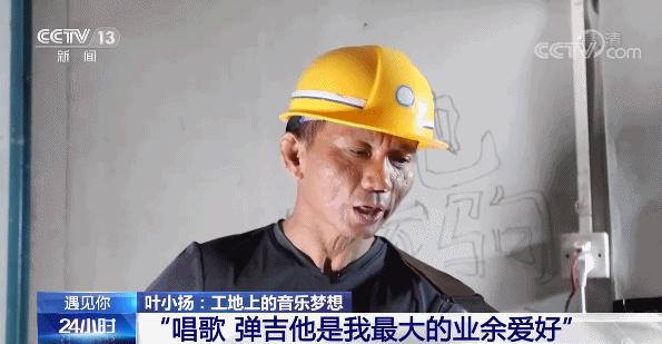 听着这歌声,像是走进了演唱会的现场,这位唱歌的人,名叫叶小扬,来自广东河源,是惠州博罗县的一名建筑工人。每天穿着工作服,戴着安全帽,在工地进进出出;但同时他也会趁工作之余拿起吉他,为工友们弹唱一曲。