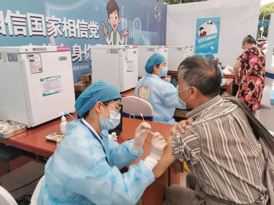 △市民在南长街“运河古邑”牌楼临时接种点接种新冠疫苗。