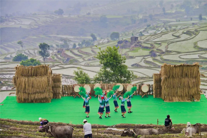远处的田埂上,村中妇女们唱起多声部山歌,而能歌善舞的姑娘小伙们更是不能闲着,他们在梯田之中搭起的舞台上载歌载舞,《栽秧鼓舞》《刀叉舞》《棕扇舞》......有力的唱腔和曼妙的舞姿为薄雾之间的梯田更添一分世外桃源的意味,宛若仙境的撒玛坝美景和浓烈如酒的民族风情让游客们纵情山水,流连忘返。