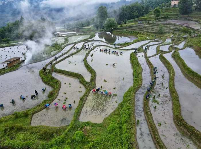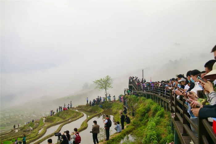 在形美如天梯、壮丽若龙脊的撒玛坝梯田上,氤氲的雾气遮盖不住人们的热情。