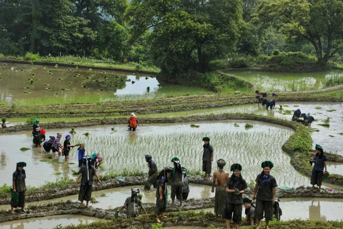 祭祀活动后,人们下田开始赶牛犁田、拔秧挑秧、栽种秧苗,近处的水田间,孩子们欢快地在田间摸鱼。
