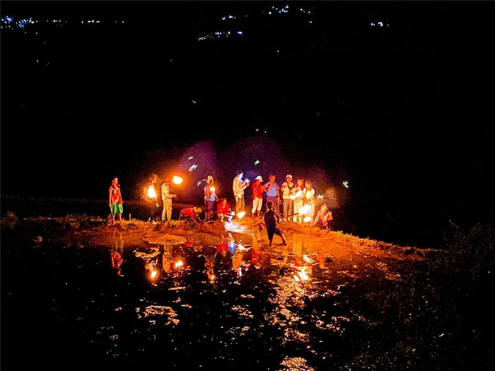 暮色四合,当地村民纷纷从家中出来,点起火把,赤脚踏进梯田之中,借着火光抓泥鳅、鳝鱼。“‘开秧门’之后,田里插了秧就不能随便下田了,今晚是我们农家的渔火良夜。”景观步道上的游客见状也纷纷参与其中,享受着“天人合一”的梯田稻作文化带来的和谐静好。
