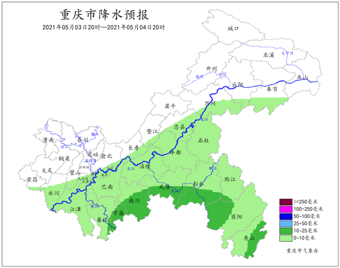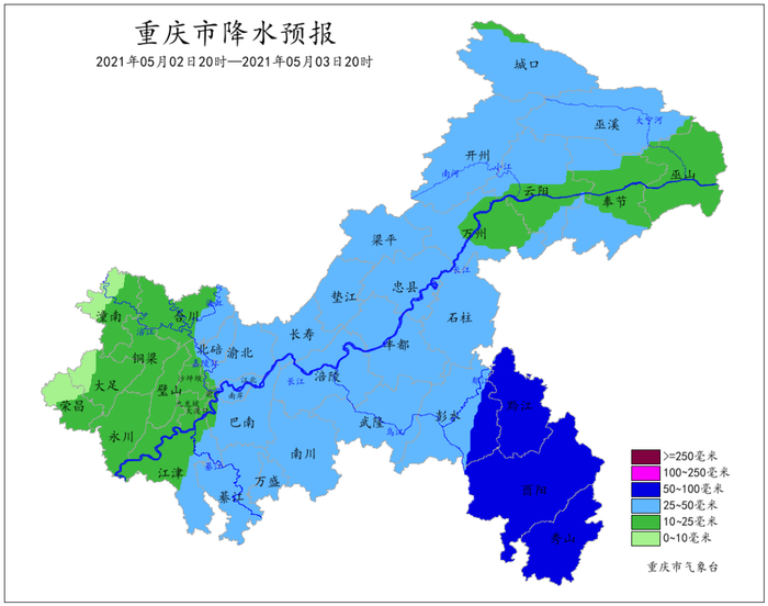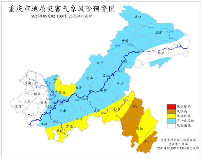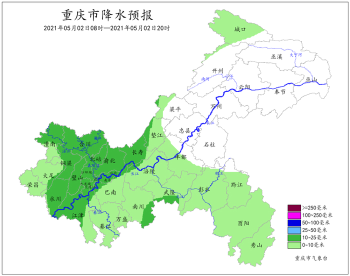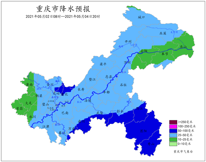 受低空急流和冷空气共同影响,5月2日到4日重庆将有一次雷雨天气过程,局地伴有阵性大风、冰雹等强对流天气,主要降雨时段为2日午后到3日上午。过程累计雨量大部地区20~60毫米,局地80毫米以上;最大小时雨量30~40毫米。