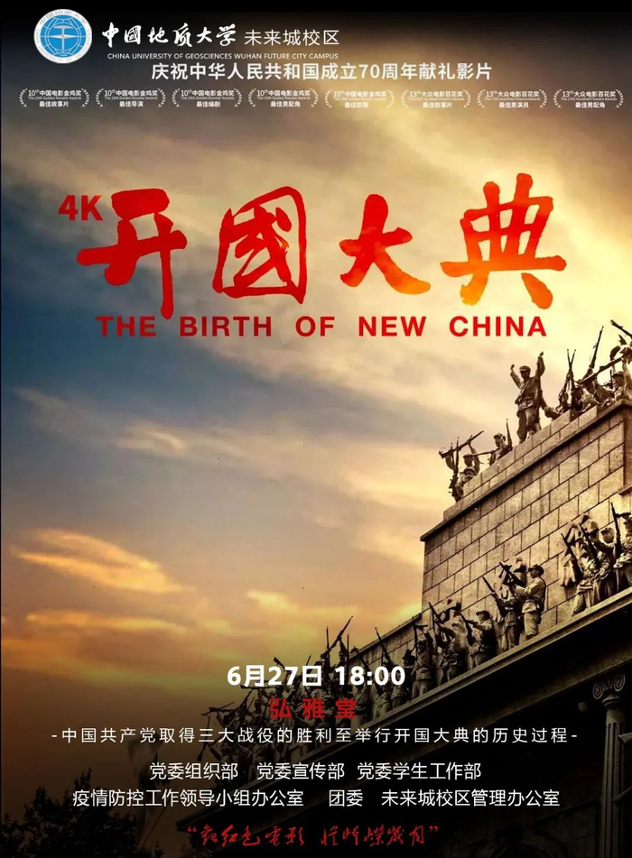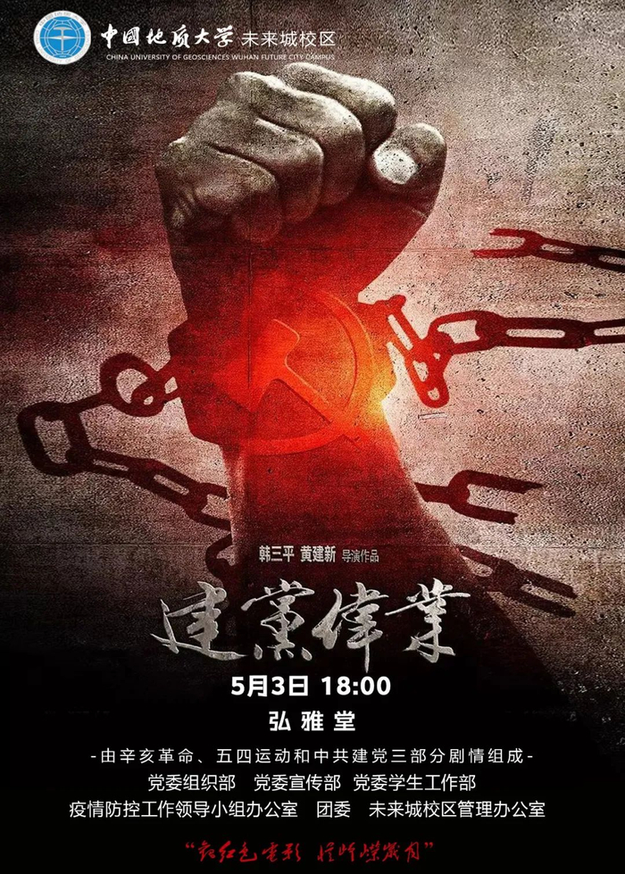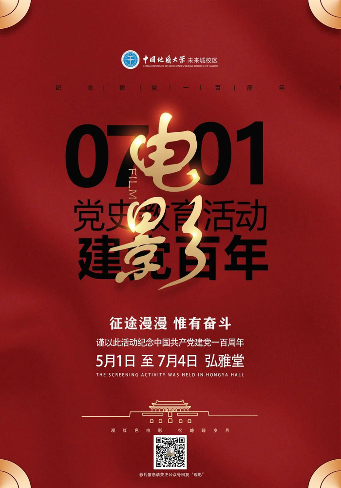 通过展映一批反映中国共产党成立以来不同历史发展时期、具有代表性意义的红色经典电影,激发党员干部群众爱党爱国的热情,激励和动员全体师生为全力建设地球科学领域世界一流大学的地大梦、实现中华民族伟大复兴的中国梦而奋斗。
