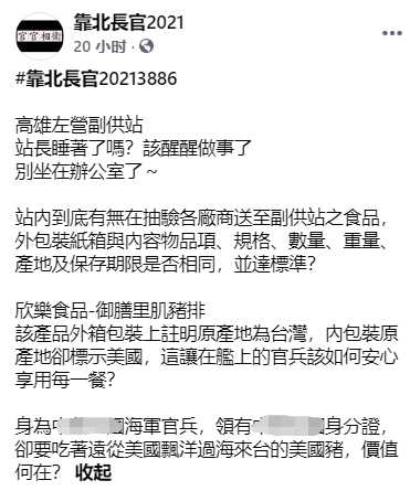 据联合新闻网报道,针对美猪进口,台湾防务部门曾称,台军将按照台湾食品规定,三军部队副食供应以“鼓励”台湾本地产猪肉为优先。而疑为军中官兵的网友3日在脸书粉丝专页“靠北长官”上帖文爆料,称高雄左营副供站供给某家食品厂供军中的“御膳里肌猪排”,产品外箱包装上注明原产地为台湾,内包装原产地却标示美国,“让在舰上的官兵该如何安心享用每一餐?”