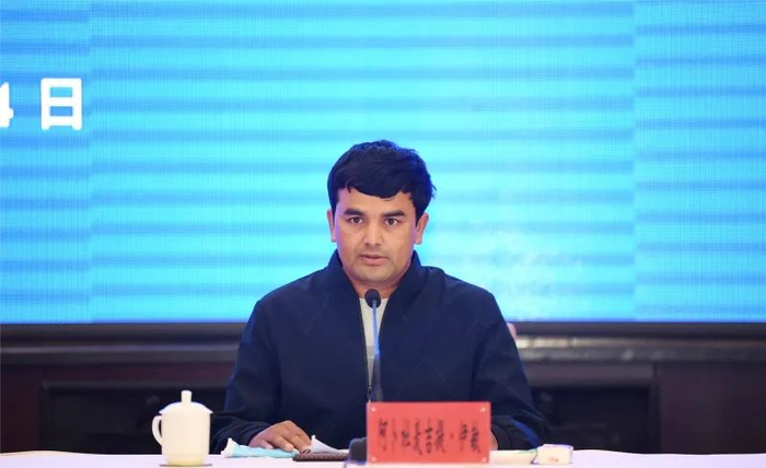 5月4日,和田地区患者家属阿卜杜麦吉提·伊敏在新闻发布会上发言。石榴云/新疆日报记者王臻摄