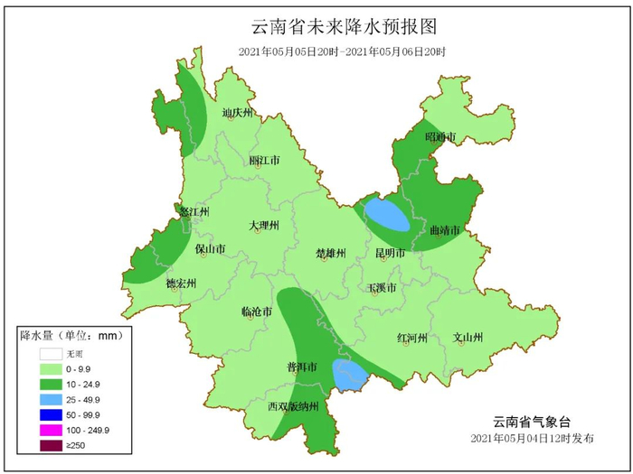 5月5日20时--5月6日20时:昭通南部、曲靖北部、昆明北部、普洱东部、西双版纳东部、红河南部阴有小到中雨局部大雨,其他地区多云有阵雨局部中雨。