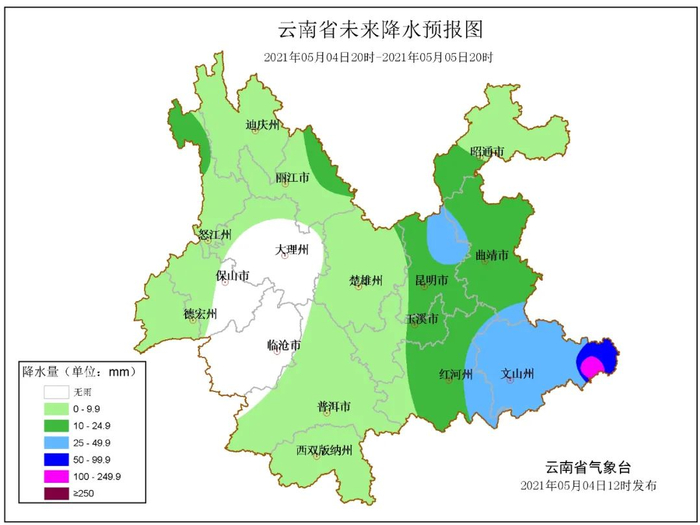 5月4日20时--5月5日20时:文山阴有大到暴雨局部大暴雨,昭通南部、曲靖、红河、玉溪东部、昆明阴有小到中雨局部大雨,昭通北部、楚雄、玉溪西部、普洱、西双版纳、丽江、迪庆、怒江、大理北部、保山西部、德宏多云有阵雨局部中雨,其他地区多云。