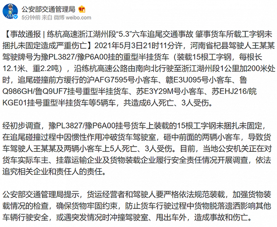 2021年5月3日21时11分许,河南省杞县驾驶人王某某驾驶牌号为豫PL3827/豫P6A00挂的重型半挂货车(装载15根工字钢,每根长12.1米、重2.2吨),沿练杭高速公路由南向北行驶至浙江湖州段1公里加200米处时,追尾碰撞前方缓行的沪AFG7595号小客车、赣E3U095号小客车、鲁Q986GH/鲁Q9UF7挂号重型半挂货车、苏E3Y29M号小客车、苏EHJ216/皖KGE01挂号重型半挂货车等5辆车,共造成6人死亡、3人受伤。