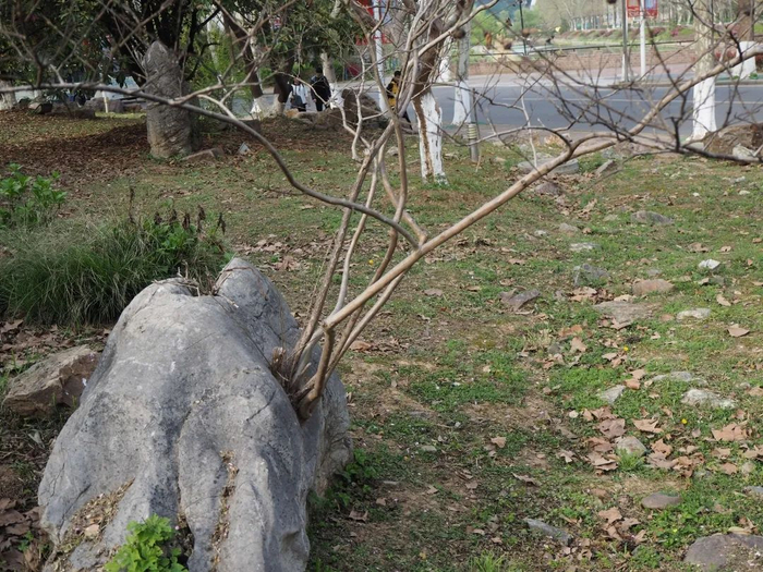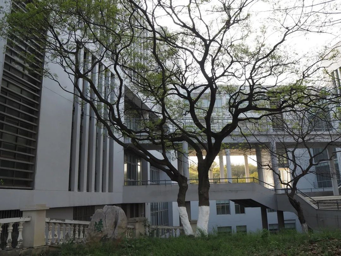 这两棵是校园中的野生朴树,生长在一起,造型奇特,关于这两棵朴树,还有一个小故事。不知道同学们有没有发现,图书馆的两侧墙壁,一侧是垂直于道路的,另一侧却是倾斜的,并不对称。之所以图书馆会变成我们今天所看到的样子,是因为当年学校在建造图书馆时,为了保留这两棵朴树,特意修改了图纸。