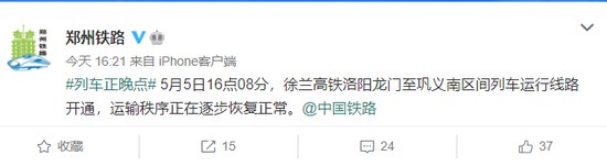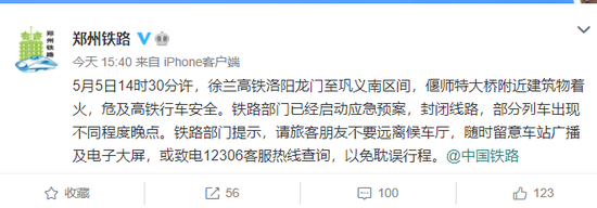 据@郑州铁路,5月5日14时30分许,徐兰高铁洛阳龙门至巩义南区间,偃师特大桥附近建筑物着火,危及高铁行车安全。铁路部门启动应急预案,封闭线路,部分列车出现不同程度晚点。当天16点08分,列车运行线路开通,运输秩序逐步恢复正常。