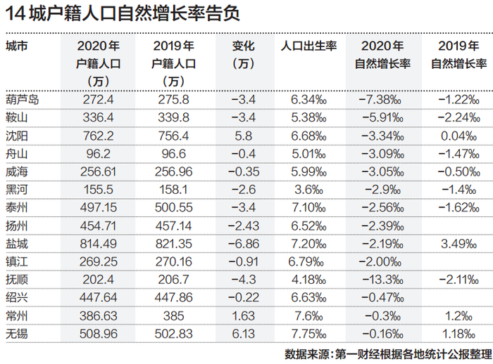 根据第一财经记者不完全统计,2020年,至少已有14个城市户籍人口自然增长率为负,分别是沈阳、无锡、葫芦岛、鞍山、黑河、抚顺、威海、舟山、泰州、扬州、盐城、镇江、绍兴、常州。