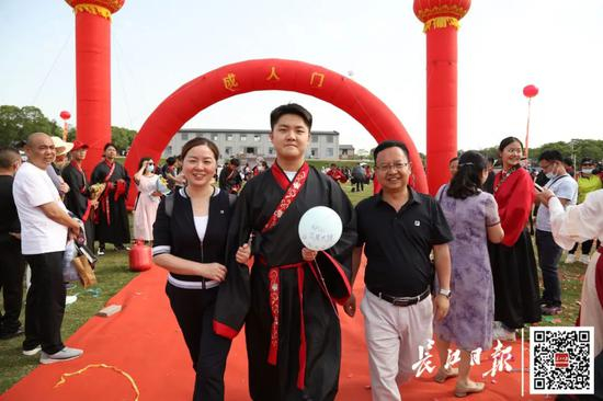 5月5日下午,武汉经济技术开发区第一中学举办成人礼。518名高三学子现场宣誓,老师家长纷纷为莘莘学子送“花式”祝福。毕业生们身着传统汉服,在父母的陪伴下跨过成人门,并合影留念。