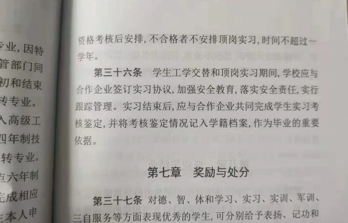 但在盐城技师学院的校企合作中,这些规定都是一纸空文。根据学院印发的学生手册,二年级在校生“工学交替”时间每学期不超过一个月。 而多位学生反映称,学校每次安排工学交替均在三个月以上。