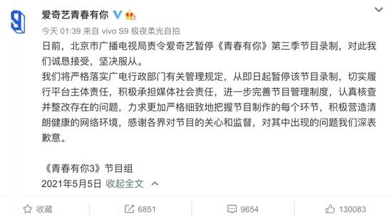5月5日凌晨,爱奇艺《青春有你》节目发布公告称,日前,北京市广播电视局责令爱奇艺暂停《青春有你》第三季节目录制,对此节目组诚恳接受,坚决服从。
