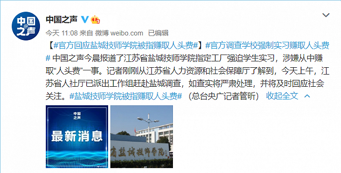 原标题:江苏盐城技师学院被指强制学生实习并赚取“人头费”,官方调查