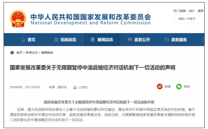 5月6日上午,中国宣布无限期暂停中澳战略经济对话机制下一切活动。下午,外交部也对此回应称,澳方对此承担所有责任。