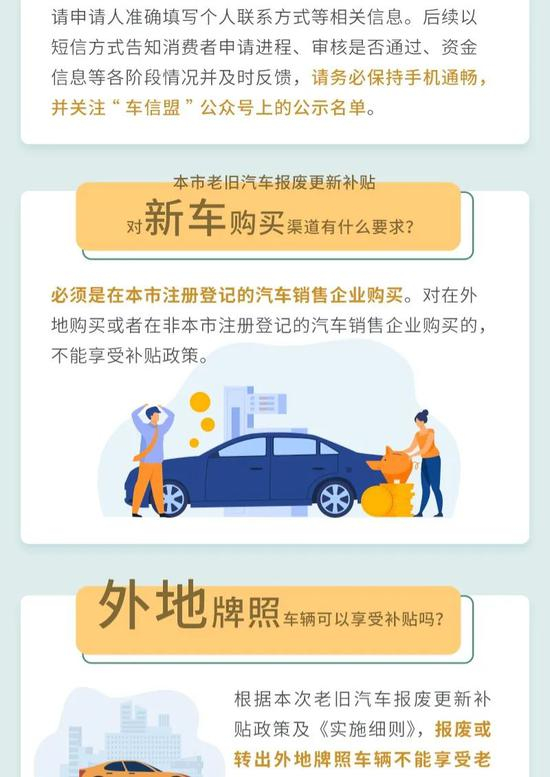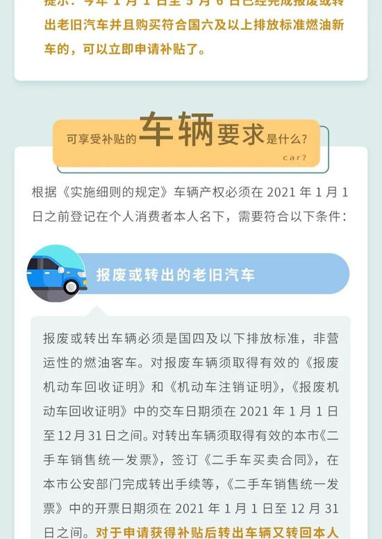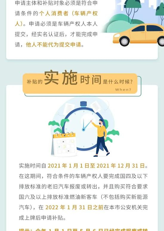 市商务委最新公布本市老旧汽车报废更新补贴实施细则:符合申请条件的个人消费者(车辆产权人),在2021年1月1日-2021年12月31日期间完成国四及以下排放标准的老旧汽车报废或转出,并购买符合要求的国六及以上排放标准燃油新客车(不包括购买新能源汽车),并在2022年1月31日之前在本市公安机关完成上牌后,可申请补贴。此次补贴标准为每辆车2800元人民币。申请通道现已开通,符合条件者可点击文末左下角“阅读原文”填报并申请。