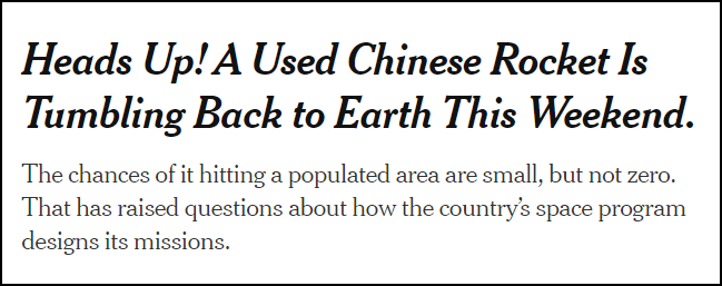 当地时间6日,《纽约时报》用“抬头(heads up,注意)!”一语双关。报道称,你几乎不会“被这个猛烈坠落回地球的23吨的火箭击中”,但“可能性不是没有”。先不说这“23吨”(实际为22吨)是载荷而不是残骸重量这种低级错误,同一篇文章也提到3月底“猎鹰9”残骸落在美国华盛顿州的事情,却称火箭曾“照亮了西雅图的夜空”,然后“让残骸掉落在一个农场”。