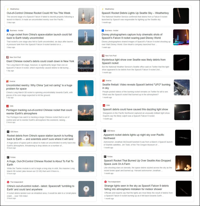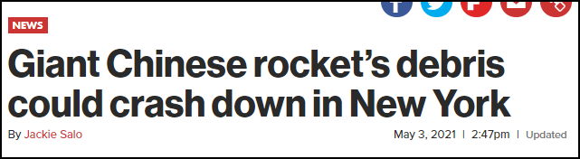 此外,美国保守派小报《纽约邮报》(NYP)3日报道长五B残骸时,标题夸张成《巨大的中国火箭残骸可能坠毁在纽约》。措辞也是极力给市民增添紧张感,称“科学家警告,非常巨大的(massive piece)中国太空垃圾,可能会让残骸倾泻在纽约或另一个大型城市。”