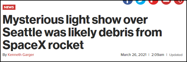 但3月底,“猎鹰9”火箭残骸掉落时,《纽约邮报》却写,“西雅图上空神秘的光可能是来自SpaceX的火箭残骸”。文中还援引当地网友的推文说“你们看见了吗,我这辈子从没见过,太壮观了。”