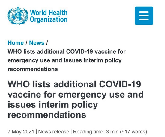 当地时间5月7日,世界卫生组织(WHO)总干事谭德塞宣布,世卫组织已将中国国药集团北京生物研究所研发的新冠疫苗列入紧急使用清单(Emergency Use Listing,EUL)。