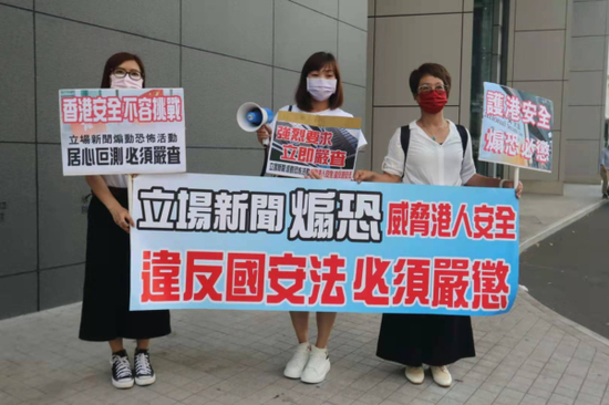 7日,多批市民到香港警察总部举报“立场新闻”涉嫌煽动恐怖活动,违反香港国安法,手持“立场新闻煽恐威胁港人安全”“违反国安法必须严惩”的横幅,以及“香港安全不容挑战”等标语,向警方代表递交举报信,希望警方严肃彻查。