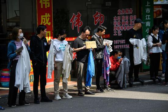 2021年 3月3日,元宵节之后的工作日,广州康乐村街头,制衣厂的老板们排成一列,手里拿着样板招募前来务工人员。图/人民视觉