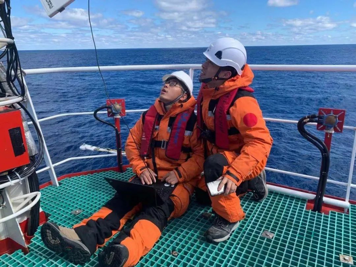 ▲张功博士(左)与科考队员在南极宇航员海调试科学桅涡动通量观测系统(来源:大气科学学院)